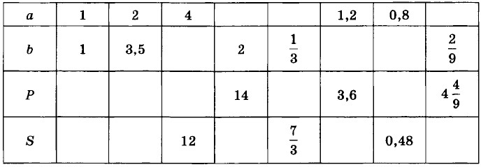 26. Пусть а см и b см — длины сторон прямоугольника, Р см — его периметр, S см2 — площадь. Заполните таблицу: