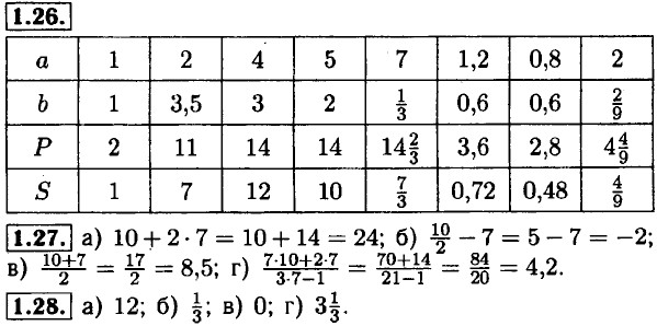 1.45. а) 7 • 6 + 24 : 3 - 2 = 42 + 8 - 2 = 48; б) 7 • (6 + 24) : (3 - 2) = 210. 1.46. а) (1 + 23 - 4) • 5 = 100; б) 111 - 11 = 100; в) (5 + 5 + 5 + 5) • 5 = 100; г) (1 + 23 - 4) • 5 + 6 - 7 - 8 + 9 = 100. 1.47. 1)4 - 4 - 4 + 4 = 0 2) 4 - 4 + 4 : 4 = 13) 4 : 4 + 4 : 4 = 2 4) (4 + 4 + 4) : 4 = 3 5) 4 + 4 • (4 - 4) = 4 б) (4 + 4 • 4) : 4 = 5 7) 4 + (4 + 4) : 4 = 6 8) 44 : 4 - 4 = 7 9) 4 • 4 - 4 - 4 = 8 10) (44 - 4) : 4 = 10.