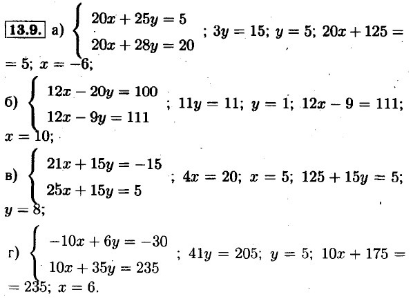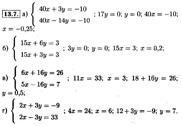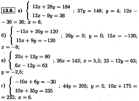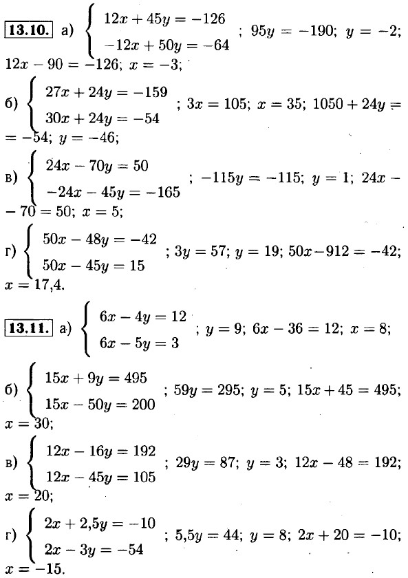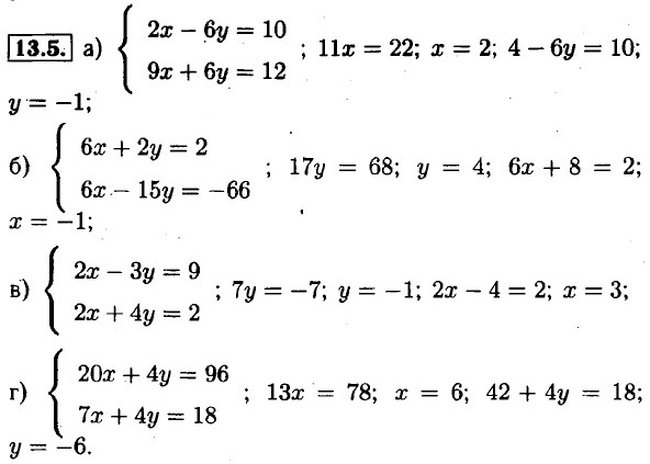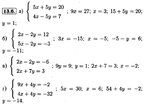 13.1. а) 2х - 12; х = 6; 6 - у = 5; у = 1; б) 2у = 6; у = 3; х + 3 = 9; х = 6; в) 5х = 20; х = 4; 8 + у = 11; у = 3; г) -2у = -4; у = 2; -х + 2 = -8; х = 10. 13.2. а) 12х = 24; х = 2; 4 + 11у = 15; у = 1; б) 38у = 38; у = 1; 9 + 13у = 35; у = 2; в) 6х = 30; х = 5; 5 - 6у = 17; у = -2; г) -11у = 44; у = -4; 9х + 28 = 19; х = -1. 13.3. а) 4у = 12; у = 3; 3 + х = 7; х = 4; б) Зх = -3; х = -1; -1 - у = 6; у = -7; в) -6у = 12; у = -2; -14 - X = —3; х = -11; г) 4х = 16; х = 4; 4 + у = -10; У = -14. 13.4. а) 2у = 60; у = 30; 4х - 210 = 30; х = 60; б) 7x = 70; х = 10; -50 + 7у = 6; у = 8; в) 11у = 88; у = 8; 3х - 48 = 12; х = 20; г) 11х = 22; х = 2; 16 + 5у = 11; y = 1.