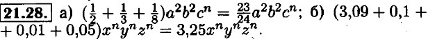 21.27. а) (42 + 54 + 48 + 12)b2с/sup>3d2 = 162b2c3d2; б) (1,8 + 3,2 + 1,05)m3n4z8 = 6,05m3n4z8.