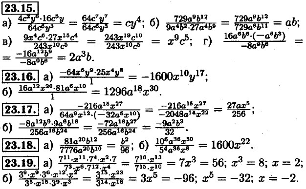 Глава 5. Одночлены. Арифметические операции над одночленами Деление одночлена на одночлен23.1. а) а; б) х5; в) у2; г) z4. 23.2. 23.3. а) 2; б) 3; в) -7; г) 9. 23.4. а) 6х; б) 3; в) -15; г) 18p3. 23.5. а) 1; б) 3; в) -5; г) 3. 23.6. а) 26с; б) -6r; в) -3,5dm; г) 11yz. 23.7. а) 3а; б) -0,8ас; в) -90s; г) -5х. 23.8. а) 3а8; б) 4; в) 2а5у; г) 2b2x. 23.9. а) 4аbс; б) 99yz; в) 12m6n2k3; г) 86p2q2r2. 23.10. а) нет; б) да; в) нет; г) да. 23.11. а) нет; б) да; в) да; г) нет. 23.12. а) * = 30х5у6z7 : 5x3y2z6 = 6x2y4z; б) * = 5а3b4с10 • 15а5b7z21 = 75а8b11c31; в) * = р3m2q7 • p8m4q9 = p11m6q16; г) * = d2n3z10 : dn2z5 = dnz5. 23.13. a) 125a6b9 : 25а2b2 = 5а4b7; б) 1000х12у12 : 4x4y6 = 250x4у6; в) 49z10t14 : 1 = 49z10t14; г) x8y12z4 : xyz = x7y11z3. 23.14. a) 16m8n8 : 16m2n2 = m6n6; 6) 55p3q4 : 1 = 55p3q4; в) -х10у15z20 : x6y6z6 = -x4y9z14; г) -125a3c9d3 : 25c2d2 = -5a3c7d.