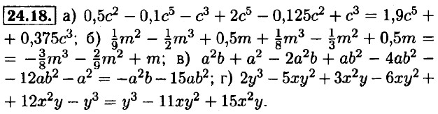 24.19. а) 2,4m3 + 7m2 - 27 + 2,25m3 - 15m = 4,65m3 + 7m2 - 15m - 27; б) 18k4 - 2,8k3 + 1,4k3 - 20k3 + 7,5k3 = 18k4 - 13,9k3; в) 2,7a4 - 4,8a3 + 1,4a4 - 5,1a3 - 6,5a2 = 4,1a4 - 9,9a3 - 6,5a2; г) 2b3 - 1,5b2 + 0,6b3 + 7b2 - 7,5b3 = -4,9b3 + 5,5b2. 24.20. a) p(a, b) = a2 + b2 - 4a6;