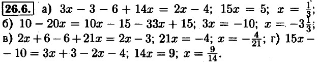 26.7. a) 2x + 1 = 5; 2x - 4; x = 2; 6) 14x - 6 = 30x + 6; 16x = -12; x = -0,75; в) 22 - 6x - 4; 6x = 18; x = 3; г) 3x + 7 = 6x + 4; 3x = 3; x = 1. 26.8. a) 15x - 2x + 1 = 3x - 19; 10x = -20; x = -0,5; 6) 80x - 30 - 21x - 7 = 140; 59x = 177; x = 3; в) 6x - 2x - 3 = x - 6; 3x = -3; x =-1; г) 7x + 98 - 30x - 5 = 70; -23x = -23; x = 1. 26.9. а) 6х2 + 12х - 6х2 + 3,5х - 31 = 0; 15,5х = 311; х = 2; б) 2х3 - х3 + 6х - 6х + 3 - 30 = 0; х3 = -27; х = -3; в) 12х2 - 96х - 12х2 + 20х = 10 - 26х; -50х = 10; х = -0,2; г) 8х2 - 40 - 10х2 - 10х + 10х + 40 = 0; -2х2 = 0; х = 0.
