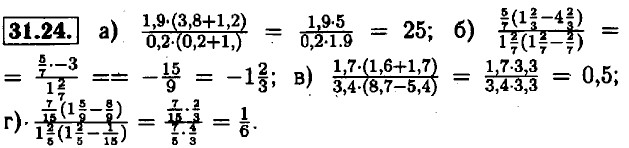 31.23. а) 0,756 • (0,756 - 0,241 - 0,415) = 0,756 • 0,1 = 0,0756; б) 0,6 • (0,25 + 2,4 - 0,65) = 0,6 • 2 = 1,2; в) 1,63 • (2,49 - 2,12 + 1,63) = 1,63 • 2 = 3,26; г) 0,2 • (6,41 - 1,25 - 0,16) = 0,2 • 0,5 = 0,01.