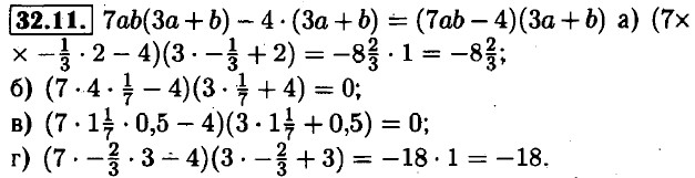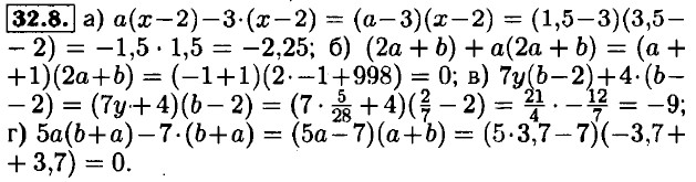 32.9. a) 8ac(5a2b - 7c) - 3b(5a2b - 7c) = (8a - 3b)(5a2b - 7c); 6) 16x(y2 + 2z2) - 5z(y2 + 2z2) = (16x - 5z)(y2 +2z2); в) 5x(6x - 5c) - 2 • (6x - 5c) = (5x - 2)(6x - 5c); г) 18xz(x - 2k) - 10ky(x - 2k) - (18xz - 10ky)(x - 2k). 32.10. a) x2 • (a - b - c) - y(a - b - c) = (x2 - y)(a - b - c); б) y2 • (x - b + 1) - a(x - b + 1) = (y2 - a)(x - b + 1); в) x(a + b + c) + y(a + b + c) = (x + y)(a + b + c); г) ab( 1 - ab + a2b2) - c(1 - ab + a2b2) = (ab - c)(1 - ab + a2b2).