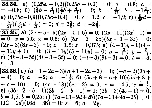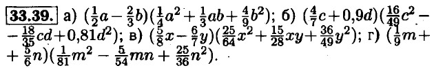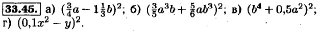 33.49. а) (а + b)2; б) (6 + 10)2; в) (4a + 7)2; г) (3с - 2)2. 33.50. а) (b - 10)2; б) (3р - 7q)2; в) (5а + 0,56)2; г) (0,16 + 10с)2. 33.51. а) (4а + 7b)2; б) (15x - 8y)2; в) (8х + 6у)2; г) (10а + 7b)2. 33.52. а) (m + 20)2; б) (7р - 5q)2; в) (3а + 7с)2; г) (5z - 8t)2.