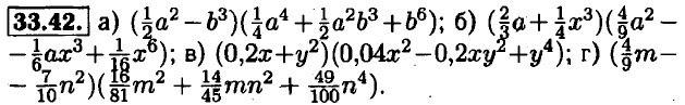 33.40. а) (а2 - 2)(а4 + 2а2 + 4); б) (0,5 - х2)(0,25 + 0,5х2 + x4); в) (3 + b3)(9 - 3b3 + b6); г) -(у + 0,25)(у2 -0,25у + 0,0625). 33.41. а) (ху - с)(х2у2 + хус + c2); б) (m2n + р4)(m4n2 - m2nр4 + р8); в) (а + mn3)(a2 - аmn3 + m2n6); г) (у - c5d6)(q2 + qc5d6 + c10d12).