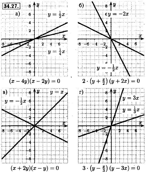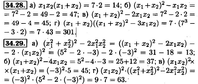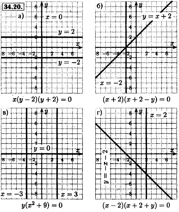 34.21. а) (x - 5)2 - 1 = (x - 5 - 1)(x - 5 + 1) = (x - 6)(x - 4); б) (у2 - 7)2 - 9 = (у2 - 7 - 3)(у2 - 7 + 3) = (у2 - 10)(у2 - 4) = (у2 - 10)(у - 2)(у + 2); в) (b2 + 2)2 - 9 = (b2 + 2 - 3)(b2 + 2 + 3) = (b2 - 1)(b2 + 5) = (b - 1)(b + 1)(62 + 5); г) (2а - 3b)2 - 4b2 = (2а - 3b - 2b)(2а - 3b - 2b) = (2а - b)(2а - 5b). 32.22. a) (2a - 3b)2 - 4b2 = (2a - 32 - 22)(2a - 32 - 22) = (2a - b) (2a - 5b); 6) (3c - 4d)2 - 9d2 = (3c - 4d - 3d) (3c - 4d - 3d) = (3c - 7d)(3c - d); в) (5a + 2b)2 - 16b2 = (5a + 2b - 4b)(5a + 2b + 4b) = (5a - 2b)(5a + 6b); г) (3m - 5k)2 - 9k2 = (3m -5k- 3k)(3m - 5k + Zk) = (3m - 8k)(3m - 2k). 34.23. a) а2 + 2а + 5a + 10 - a(a + 2) + 5 • (a + 2) - (a + 5)(a + 2); б) х4 + 3x2 + 4х2 + 12 = х2 • (х2 + 3) + 4 • (х2 + 3) = (х2 + 3)(х2 + 4); в) b2 + b - 4b - 4 = b(b + 1) - 4 • (6 + 1) = (b - 4)(b + 1); г) у4 - у2 - 4у2 + 4 = у2 • (у2 - 1) - 4 • (у2 - 1) = (у2 - 1)(y2 - 4) = (у - 1)(y + 1 )(у - 2)(у + 2). 34.24. a) x2 + 2xy + 3xy + 6y2 = x(x + 2y) + 3y(x + 2y) = (x + 3y)(x + 2y); 6) 4m2 - 4mn - mn + n2 = = 4m(m - n) - n(m - n) = (4m - n)(m - n); в) p2 + pq - 2pq - 2q2 = p(p + q) - 2q(p + q) = (p - 2q)(p + q); г) a2 + ab + 6ab + 6b2 = a(a + b) + 6b(a + b) = (a + 6b)(a + b). 34.25. а) х(х2 - 1) = 0; х(х - 1)(х +1) = 0; х = 0; х = 1; х = -1; б) у(16 - у2) = 0; у(4 - у)(4 + у) = 0; у = 0; у = 4; у = -4; в) с2 • (с + 1) = 0; с = 0; с = -1; г) d(d2 + 1) = 0. 34.26. а) х2 • (х + 1) - 4 • (х + 1) = 0; (х2 - 4)(х + 1) = 0; (х - 2)(х + 2)(х + 1) = 0; х = 2; х = -2; х = -1 б) у2 • (у + 2) - 4 • (у + 2) = 0; (у2 - 4)(у + 2) = 0; (у-2)(у + 2)2 = 0; у = 2; у = -2 в) 9 • (z + 1) - z2 • (z + 1) = 0; (9 - z2)(z + 1) = 0; (3 - z)(3 + z)(z +1) =0; 2 = 3; z = -3; z = -1 г) р2 • (р - 1) - 4 • (р - 1) = 0; (р2 - 4)(р - 1) = 0; (р - 2)(р + 2)(р - 1) = 0; р = 2; р = -2; р = 1.