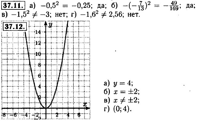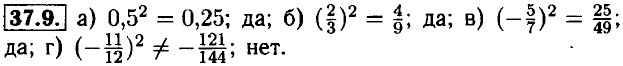 37.7. а) 22 = 4; да; б) 32 ≠ 6; нет; в) 42 ≠ 8; нет; г) (-3)2 = 9; да. 37.8. а) 0,52 = 0,25; да; б) 1,22 ≠ 2,4; нет; в) 1,52 ≠ 3; нет; г) (-2,5)2 = 6,25; да.
