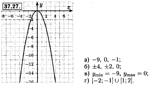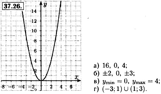 37.14. а) наибольшее 1; наименьшее 0; [—1; 1]; б) наибольшее 9; наименьшее 0; [-3; 2]; в) наибольшее не существует; наименьшее 0; (-2; 1]; г) наибольшее 9; наименьшее 0; [-1; 3]. 37.15. а) наибольшее не существует; наименьшее 0; [-2; 3); б) наибольшее 9 наименьшее 0; [-3; 0]; в) наибольшее 9; наименьшее 0; [-2; 3]; г) наибольшее не существует; наименьшее 0; (-3; 2). 37.16. а) наибольшее 4; наименьшее 0; (-2; 2]; б) наибольшее 9; наименьшее (-1); [-3; -1]; в) наибольшее не существует; наименьшее 0; (-2; 3); г) наибольшее не существует; наименьшее 0; (-1; 3). 37.17. а) наибольшее 9; наименьшее не существует; [-3; -2); б) наибольшее 9; наименьшее не существует; (2; 3); в) наибольшее 9; наименьшее не существует; (0; 3); г) наибольшее 9; наименьшее не существует; [-3; -1). 37.18. a) Уmin = 1; Уmах = 4; б) Уmin = 0; Уmах = 4; в) Уmin = 0; Уmах = 1 г) Уmin = 0; Уmах = 9. 37.19. а) Уmin = 0, Уmах = 1; б) Уmin = 0; Уmах = 9;в) Уmin = 0; Уmах = 9; г) Уmin = 0; Уmах = 9. 37.20. а) 0; б) 0; в) 0; г) 0. 37.21. a) Уmin = 0, Уmах = 1; б) Уmin = 0; Уmах = -9; в) Уmin = 0; Уmах = 9; г) Уmin = 0; Уmах = 9. 37.22. a) Уmin = -4, Уmах = 0, 6) Уmin = -4; Уmах = 0; в) Уmin = -9; Уmах = -4, г) Уmin = -9, Уmах = -1. 37.23. а) 0; б) 0; в) 0; г) 0. 37.24. а) 0; б) 0; в) 0; г) 0. 37.25. а) 0; б) 0; в) -4; г) -9.