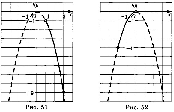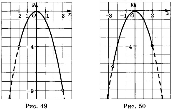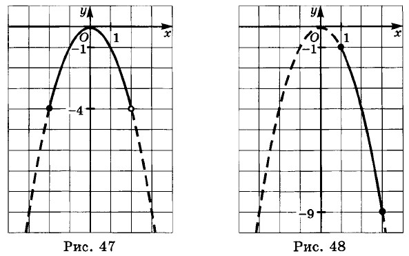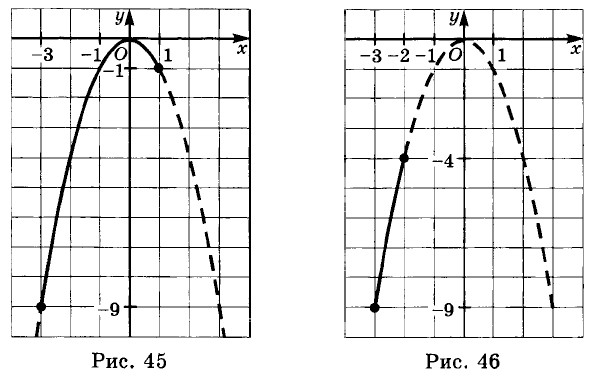 Используя выделенную часть графика функции у = -х2, найдите наибольшее и наименьшее значения функции и укажите, какому промежутку оси абсцисс соответствует выделенная часть: 37.16. а) На рис. 45; б) на рис. 46; в) на рис. 47; г) на рис. 48.