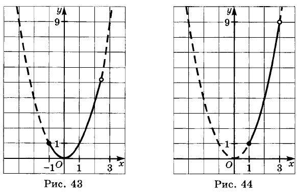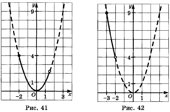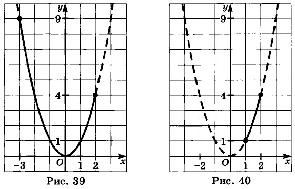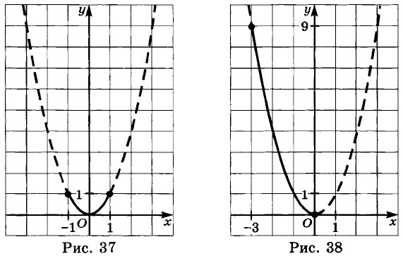 Используя выделенную часть графика функции у = х2, найдите наибольшее и наименьшее значения функции и ответьте на вопрос, какому промежутку оси абсцисс соответствует выделенная часть: 37.14. а) На рис. 37; б) на рис. 38; в) на рис. 39; г) на рис. 40.