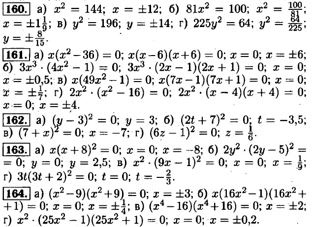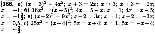 165. а) (x - 1)2 = 9; x - 1 = 3; x = 4; x - 1 = -3; x = -2; б) (у + 1)2 = 81; у ± 1 = 9; у = 9; у + 1 = -9; у = -10; в) (x + 2)2 = 36; x + 2 = 6; x = 4; x + 2 = -6; x = -8; г) (у - 7)2 = 100; у - 7 =10; у = 17; у - 7 = -10; у = -3.