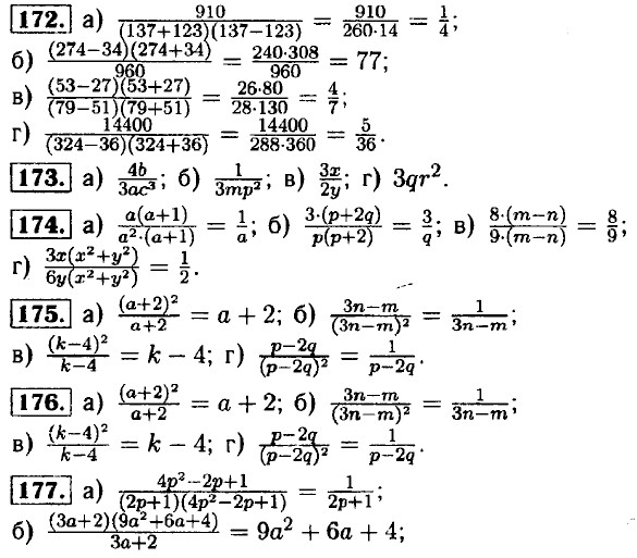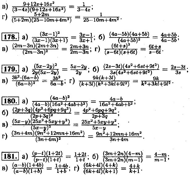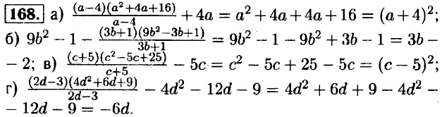 169. a) a3 + b3 + 3а2b + 3аb2 = (a + b)3; 6) a3 - b3 - 3a2b + 3ab2 = (a - b)3. 170. a) (70 - 1)(70 + 1) =4900 - 1 = 4899; 6) (40 + 2)(40 - 2) = 1600 - 4 = 1596; в) (90 - 1)(90 + 1) = 8100 - 1 = 8099; г) (60 - 2)(60 + 2) = 3600 - 4 = 3596. 171. a) (90 + 1) = 8100 + 180 + 1 = 8281; 6) (60 - 1) = 3600 - 120 + 1 = 3481; в) (80 + 2) = 6400 + 320 + 4 = 6724; г) (70 - 2) = 4900 - 280 + 4 = 4624.