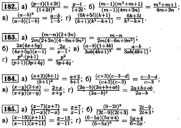 Глава 9. Итоговое повторение Алгебраические преобразования (окончание)155. а) (x - 3)(x2 + 3x + 9); б) (2а + 1)(4а2 - 2а + 1); в) (a + 5)(а2 -5а + 25); г) (1 - 3у)(1 + 3у + 9у2). 156. а) (x - 4 - 3x)(x - 4 + 3x) - (-2x - 4)(4x - 4) = -8 (1- x)(x + 2); б) (2x - у - x - 3у)(2x - у + x + 3у) = (x - 4у)(3x + 2у); в) (12 - а - 9)(12 + а + 9) = (3 - а)(21 + а); г) (z + 1 - 2z + 3)(z + 1 + 2z - 3) = (4 - z)(3z - 2). 157. a) (4 - p)2; б) (5x + 2у)2; в) (6q + 1)2; г) (m - 7n)2. 158. a) 5 • (p - 3q)2; 6) xz(x + 2z)2; в) 2 • (с + 5d)2; г) 3n(m - 1)2. 159. a) (x - 2)(x - 3); 6) (t + 1 )(t + 5); в) (z - 2)(z - 4); г) (у + 1)(у + 8).