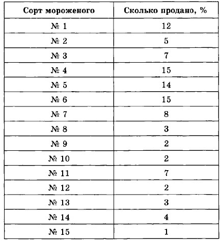 (Продолжение задачи П.20.) В тот же день в другом киоске той же фирмы произвели подсчёт распределения такого же общего количества проданного мороженого. Однако результаты сразу перевели в проценты. Получилось вот что: