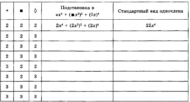 а) Выпишите результат для случая, когда все множители равны 2. Приведите одночлен к стандартному виду. б) Заполните таблицу по образцу: