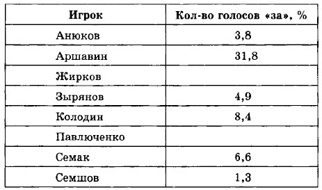 По итогам чемпионата Европы по футболу 2008 года на сайте www.ftb.ru определялся лучший игрок сборной России. Проголосовало 7000 человек. Результаты голосования занесены в таблицу: