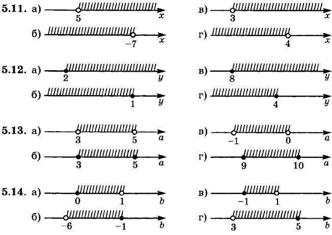 По данной аналитической модели назовите соответствующий числовой промежуток, запишите его обозначение, постройте геометрическую модель: 5.17. а) х > 3; б) х ≥ 3; в) х < 3; г) х ≤ 3. 5.18. а) 2 < х < 4; б) 3 ≤ х < 5; в) 0 ≤ х ≤ 7; г) 5 < х ≤ 8. 5.19. а) х ≥ 2; б) -5 < х < -2; в) х < 0; г) 4 ≤ х < 8.