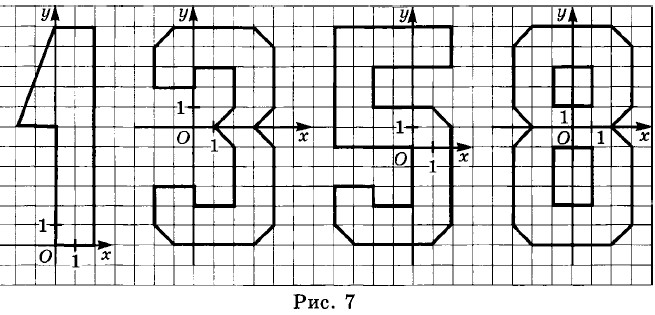 6.31. Даны три вершины А(1; 1), В(1; 3), С(3; 3) квадрата ABCD. Найдите координаты точки D, постройте этот квадрат и ещё три квадрата, один из которых расположен ниже данного на пять единиц, второй — на две единицы правее данного, третий — на три единицы ниже и пять единиц левее данного. Назовите координаты вершин третьего квадрата А3В3С3D3. 6.32. Запишите координаты точек, с помощью которых можно построить цифры, изображённые на рис. 7: а) цифра 1; б) цифра 3; в) цифра 5; г) цифра 8.