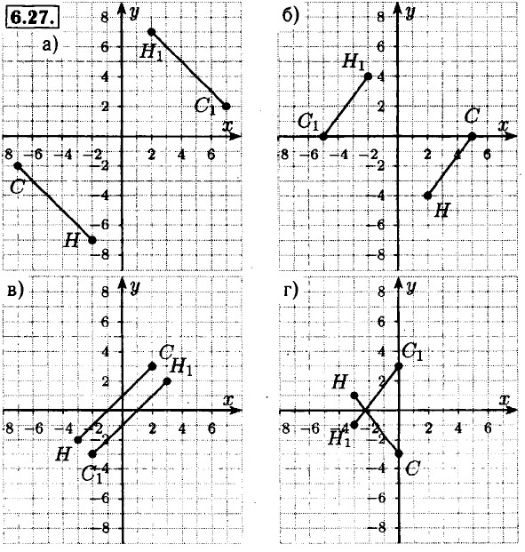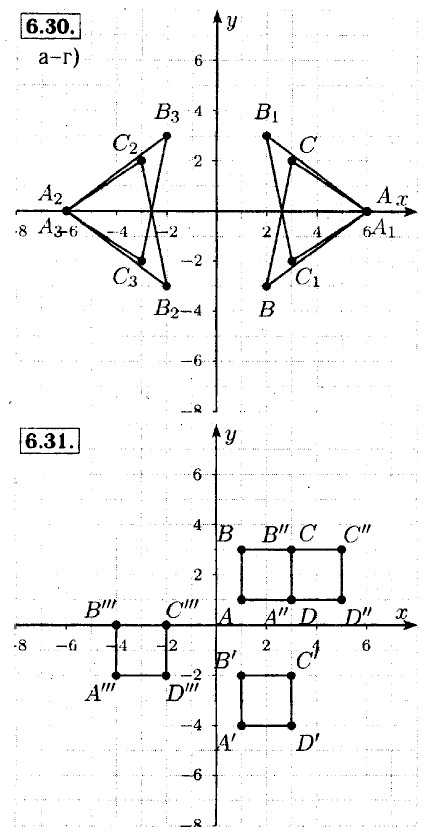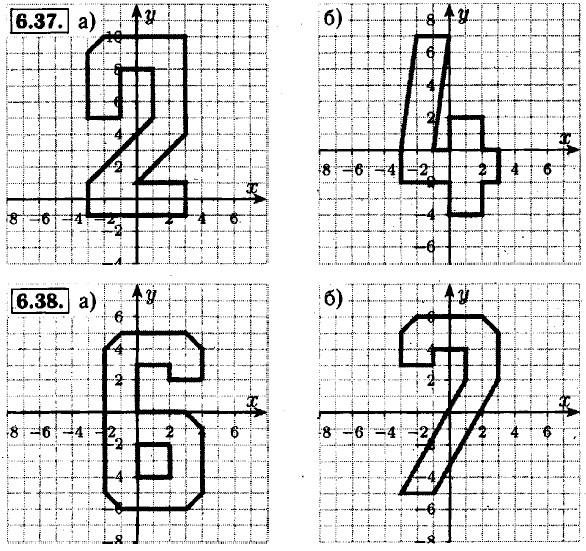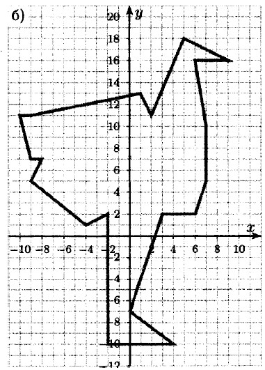 6.32. а) (0; 0); (0; 6); (-2; 6); (0; 11); (2; 11); (2; 0); б) (0; 2); (-2; 2); (-2; 4); (-1; 5); (3; 5); (4; 4); (4; 1); (3; 0); (4; -1); (4; -4); (3; -5); (-1; -5); (-2; -4); (-2; -2); (0; -2); (0; -3); (2; -3); (2; -1); (1; 0); (2; 1); (2; 3); (0; 3); в) (-4; 0); (-4; 6); (2; 6); (2; 4); (-2; 4); (-2; 2); (1; 2); (2; 1); (2; -4); (1; -5); (-3; -5); (-4; -4); (-4; -2); (-2; -2); (-2; -3); (0; -3); (0; 0); г) (-1; 1); (-1; 3); (1; 3); (1; 1); (-1; -1); (1; -1); (1; -4); (-1; -4); (-2; 0); (-3; 1); (-3; 4); (-2; 5); (2; 5); (3; 4); (3; 1); (2; 0); (3; -1); (3; -5); (2; -6); (-2; -6); (-3; -5); (-3; -1). 6.33. 1) Вершины С и D справа от отрезка АВ, тогда С(8; -4); D(8; 1).