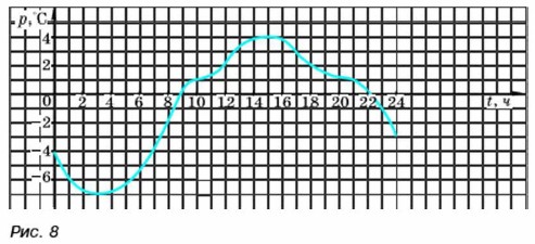 Глава 2. Функции Что такое функцияНа практике мы часто встречаемся с зависимостями между различными величинами. Например, площадь круга зависит от его радиуса, масса металлического бруска зависит от его объёма и плотности металла, объём прямоугольного параллелепипеда зависит от его длины, ширины и высоты. В дальнейшем мы будем изучать зависимость между двумя величинами. Рассмотрим примеры. Пример 1. Площадь квадрата зависит от длины его стороны. Пусть сторона квадрата равна а см, а его площадь равна S см2. Для каждого значения переменной а можно найти соответствующее ему значение переменной S. Так, например: если а = 3, то S = 32 = 9; если а = 15, то S = 152 = 225; если а = 0,08, то S = 0,082 = 0,0064. Зависимость переменной S от переменной а выражается формулой S = a2 (по смыслу задачи а > 0). Переменную а, значения которой выбираются произвольно, называют независимой переменной, а переменную Sy значения которой определяются выбранными значениями а, называют зависимой переменной. Пример 2. Путь, пройденный автомобилем со скоростью 50 км/ч, зависит от времени движения. Обозначим время движения автомобиля (в часах) буквой t, а пройденный путь (в километрах) буквой s. Для каждого значения переменной t, где t ≥ 0, можно найти соответствующее значение переменной s. Например: если t = 0,5, то s = 50 • 0,5 = 25; если t = 2, то s = 50 • 2 = 100; если t = 3,5, то s = 50 • 3,5 = 175. Зависимость переменной s от переменной t выражается формулой s = 50t. В этом примере t является независимой переменной, a s — зависимой переменной. Пример 3. На рисунке 8 изображён график температуры воздуха в течение суток. С помощью этого графика для каждого момента времени t (в часах), где 0 ≤ t ≤ 24, можно найти соответствующую температуру р (в градусах Цельсия). Например: если t = 7, то р = -4; если t = 12, то р = 2; если t = 17, то р = 3; если t = 22, то р = 0. Здесь t является независимой переменной, а р — зависимой переменной.
