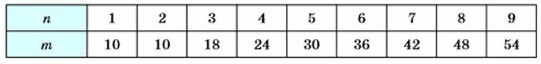 По этой таблице для каждого значения n, где п = 1, 2, ..., 9, можно найти соответствующее значение m. Так, если n = 2, то m = 10; если n = 6, то m = 36; если n = 9, то m = 54. В этом случае n является независимой переменной, а m — зависимой переменной.