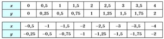 С этим и связано название «прямая пропорциональность» в отличие от «обратной пропорциональности», с которой вы познакомитесь позже. В повседневной жизни мы часто встречаемся с зависимостями между переменными, которые являются прямыми пропорциональностями. Приведём примеры. Пример 1. Путь s км, пройденный автомобилем за t ч с постоянной скоростью 70 км/ч, вычисляется по формуле s = 70t, где t > 0, т. е. зависимость s от t является прямой пропорциональностью. Пример 2. Стоимость р товара в рублях по цене 15 р. за килограмм вычисляется по формуле р = 15x, где х — масса товара в килограммах. Зависимость р от х является прямой пропорциональностью. Пример 3. Длина окружности С вычисляется по формуле С = 2πr, где r — радиус окружности, π — число, приближённо равное 3,14. Значит, зависимость С от r является прямой пропорциональностью (коэффициент пропорциональности здесь равен 2π). Выясним, что представляет собой график прямой пропорциональности. В качестве примера рассмотрим функцию у = 0,5x и построим график этой функции. Область определения функции у = 0,5х — множество всех чисел. Составим таблицу соответственных значений переменных х и у для некоторых значений аргумента х:
