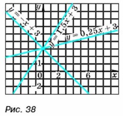Из формулы у = kx + b следует, что при х = 0 значение у равно b. Значит, график функции у = kx + b пересекает ось у в точке с координатами (0; b). На рисунке 38 изображены прямые, которые являются графиками функций, заданных формулами вида у = kx + b с различными k и одним и тем же значением b. Все эти прямые пересекаются в одной точке, лежащей на оси у.
