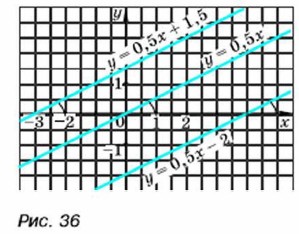 На рисунке 36 изображены прямые, которые являются графиками линейных функций, заданных формулами вида у = kx + b с одинаковыми коэффициентами при х и различными значениями b. Все эти прямые параллельны и наклонены k оси х под одним и тем же углом. Этот угол зависит от коэффициента k.