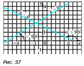Число k называют угловым коэффициентом прямой — графика функции у = kx + b. Если k > 0, то угол наклона прямой у = kx + b к оси х острый; если k < 0, то этот угол тупой. На рисунке 37 для каждого случая этот угол показан с помощью стрелки.
