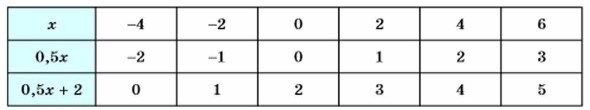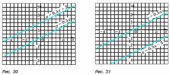 Из приведённой таблицы и формул у = 0,5х и у= 0,5х + 2 ясно, что для любого значения аргумента х значение функции у = 0,5х + 2 на 2 единицы больше значения функции у = 0,5х. Бели график функции у = 0,5х сдвинуть на 2 единицы вверх (т. е. в направлении оси у), то каждая точка (х0; у0) графика функции у = 0,5х перейдёт в точку (х0; y0 + 2) графика функции у = 0,5х + 2. При этом любая точка графика функции у = 0,5х + 2 получается из соответствующей точки графика функции у = 0,5х. Следовательно, график функции у = 0,5х + 2 есть прямая, параллельная графику функции у = 0,5х, проходящая через точку (0; 2) (рис. 30).
