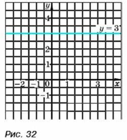 Формула у = kх + b при k = 0 принимает вид у = b. В этом случае графиком функции у = kх + b является прямая, параллельная оси х при b ≠ 0 или сама ось х при b = 0. На рисунке 32 построен график функции у = 3.