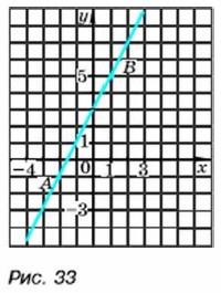 если х = -2, то у = 2 • (-2) + 3 = -1; если х = 1, то у = 2 • 1 + 3 = 5. Отметим точки А (-2; -1) и В(1; 5). Проведём через эти точки прямую (рис. 33). Прямая АB есть график функции у = 2х + 3.
