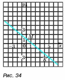 если х = 0, то у = -0,8 • 0 + 1 = 1; если х = 5, то у = -0,8 • 5 + 1 = -3. Отметим точки М(0; 1) и К(5; -3) и проведём через них прямую (рис. 34). Прямая МК — график функции у = -0,8x + 1.