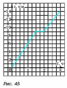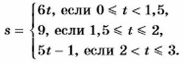 § 6. Линейная функция Задание функции несколькими формуламиРанее вы встречались с примерами, когда функция задавалась одной формулой. Однако нередко встречаются ситуации, когда функцию задают несколькими формулами. Приведём примеры. Пример 1. Турист первую часть пути от дома до станции шёл полтора часа со скоростью 6 км/ч. Затем полчаса он отдыхал, а после отдыха оставшуюся часть пути до станции он прошёл за один час со скоростью 5 км/ч. Расстояние s (в километрах) от дома до места нахождения туриста является функцией времени t (в часах). Покажем, что эту функцию можно задать тремя формулами. Когда время t изменяется от 0 до 1,5 ч, расстояние от туриста до дома равно 6/ км, т. е. s = 61, если 0 ≤ t < 1,5. В период от 1,5 до 2 ч расстояние от туриста до дома остаётся неизменным, равным 9 км, т. е. s = 9, если 1,5 ≤ t ≤ 2. Когда время t изменяется от 2 до 3 ч, расстояние от туриста до дома равно 9 + 5(t - 2) км, т. е. s = 5t - 1, если 2 < t ≤ 3. «Это можно записать короче: