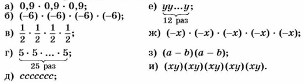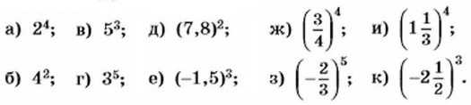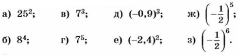 375. Назовите основание и показатель степени: а) 3,54; б) (—0,1 )3; в) (-100)4; г) (-а)6; Используя определение степени, представьте степень в виде произведения. 376. Выполните возведение в степень: