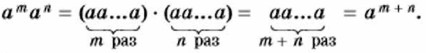 § 7. Степень и ее свойства Умножение и деление степенейВыражение а2а3 представляет собой произведение двух степеней с одинаковыми основаниями. Это произведение можно записать в виде степени с тем же основанием: а2а3 = (аа) • (ааа) = ааааа = а5. Значит, а2а3 = а2 + 3. Мы видим, что произведение а2а3 равно степени с тем же основанием и показателем, равным сумме показателей перемножаемых степеней. Аналогичным свойством обладает произведение любых степеней с одинаковыми основаниями.