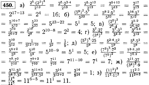 Домашние работы Возведение в степень произведения и степени440. а) (а5)2 = a5 • 2 = а10; 6) а5а2 = а5 + 2 = а7; в) (а4)3 = а4 • 3 = а12; г) а3а4 = а3 + 4 = а7; д) а5а5 = а5 + 5 = а10; е) (а5)5 = а5 • 5 = а25. 441. а) аnа3 = аn + 3; б) ааm = аm + 1; в) а2аm = аm + 2; г) (а2)m = а2m; д) (аn)3 = а3n; е) (а3)n = а3n. 442. а) 254 = (52)4 = 52 • 4 = 58; б) 1253 = (53)3 = 53 • 3 = 59; в) 6252 = (54)2 = 54 • 2 = 58. 443. а) 220 = 22 • 10 = (22)10; б) 220 = 24 • 5 = (24)5; в) 220 = 25 • 4 = (25)4; г) 220 = 210 • 2 = (210)2. 444. а) 4 = 22, 260 = 22 • 30 = (22)30 = 430; б) 8 = 23, 260 = 23 • 20 = (23)20 = 820; в) 16 = 24; 260 = 24 • 15 = (24)15 = 1615; г) 32 = 25, 260 = 25 • 12 = (25)12 = 3212. 445. а12 = а2 • 6 = (а2)6, а12 = а3 • 4 = (а3)4. 446. Известно, что а2 = m, тогда а6 = а2 • 3 = (а2)3 = m3. 447. а) х3 • (х2)5 = х3 • х2 • 5 = х3 • х10 = х3 + 10 = х13; б) (а3)2 • а5 = а3 • 2 • а5 = а6 • а5 = а6 + 5 = а11; в) (а2)3 • (а4)2 = а2 • 3 • а4 • 2 = а6 • а8 = а6 + 8 = а14; г) (х2)5 • (х5)2 = x2 • 5 • х5 • 2 = х10 • х10 = x10 + 10 = х20; д) (m2m3)4 = (m2 + 3)4 = (m5)4 = m5 • 4 = m20; е) (x4x)2 = (х4 + 1)2 = (х5)2 = х5 • 2 = х10. 448. а) (а2)4 = а2 • 4 = а8; б) а3 • (а3)2 = а3 • а3 • 2 = а3 × а6 = а3 + 6 = а9; в) (а5)2 • (а2)2 = а5 • 2 • а2 • 2 = а10 • а4 = а10 + 4 = а14; г) (а3)3 • (а3)3 = а3 • 3 • а3 • 3 = а9 • а9 =а9 + 9 = a18; д) (а3а3)2 = (а3 + 3)2 = (a6)2 = а6 • 2 = а12; е) (аа6)3 = (а1 + 6)3 = (а7)3 = а7 • 3 = а21. 449. а) x5 • (x2)3 = х5 • x2 • 3 = x5 • x6 = x5 + 6 = x11; б) (x3)4 • х8 = х3 • 4 • x8 = x12 • x8 = x12 + 8 = x20; в) (x4)2 • (x5) = x4 • 2 • x5 • 3 = x8 • x15 = x8 + 15 = x23; г) (x2)3 • (x3)5 = x2 • 3 • x3 • 5 = x6 • x15 = x6 + 15 = x21; д) (x3)2 • (x4)5 = x3 • 2 • x4 • 5 = x6 • x20 = x6 + 20 = x26; е) (x7)3 • (x3)4 = x7 • 3 x3 • 4 = x21 • x12 = х21 + 12 = x33.