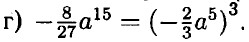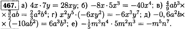 468. а) -11х2у • 0,3х2у2 = -3,3x4y3; б) a5b • (-ab3c) = -а6b4с; в) 4ху • (-x2) • (-у3) = 4x3y4; г) а2х5b × (-0,бахb2) • 0,6а2b3 = -0,36а5х6b6. 469. а) 3,5 • 3m = 10,5m; б) -6ах3 • 9bх2 = -54а6х5; в) -8а2b2 • (-8а3b5) = 64а5b7; г) ab • (-7аb2) × 4а2b = —28а4b4; д) 10х2у • (-ху2) • 0,6х3 = -6х6y3; е) -9аb2 • 3а3 • (-4b) = 108а4b3. 470. 6а2b3 = 3а2 • 3b3 = 6аb • аb2. 471. а) -12х4y3 = -12ху • х3у2 = —ху2 • 12х3у; б) -12х4у3 = -12ху • ху • х2у = -ху • 4х3 • 3у. 472. а) (3х2)3 = 33х2 • 3 = 27х6; б) (4m)2 = 42m2 = 16m2; в) (-2a4b2)3 = -23 • а4 • 3 • b2 • 3 = -8а12b6; г) (-3х2у)4 = 34х2 • 4у4 = 81х8у4; д) (-а2bс3)5 = -а2 • 5b5с3 • 5 = -а10b5с15; е) (-а3b2с)2 = а3 • 2b2 • 2c2 = а6b4с2. 473. а) (2m3)4 = 24m3 • 4 = 16m12; б) (3а)2 = 32а2 =9а2; в) (-0,6m3n2)3 = -0,63m3 • 3n2 • 3 = -0,216m9n6; г) (-2ху3)2 = 22х2у3 • 2 = 4х2у6; д) (-ху4b2)4 = х4у4 • 4b2 • 4 = х4у16b8; е) (-х2у3m)5 = -х2 • 5у3 • 5m5 = -х10у15m5. 474. а) (5х2у3)2 = 52х2 • 2у3 • 2 = 25х4у6; б) (-4ах3)3 = -43а3х3 • 3 = -64а3х9; в) (-2m3n2)4 = 24m3 • 4n2 • 4 = 16m12n8; г) (-а2bс3)5 = -а2 • 5b5с3 • 5 = -а10b5с15. 475.1 а) 81х4 = (9х2)2; б) 121а6 = (11а3)2; в) 0,09у12 = (0,3у6)2; 476. а) 64х9 = (4х3)3; б) 0,001у12 = (0,1у4)3; в) -0,008b6 = (-0,2b2)3; 477. a) 9b2с2 = (3bc)2, 100m2n6 = (10mn3)2; б) -a3b6 = (-аb2)3, -27х6b9 = (-3х2b3)3.