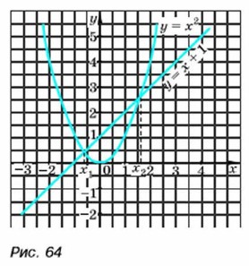 Построим в одной системе координат графики функций у = х2 и у = х + 1 (рис. 64). Эти графики пересекаются в двух точках. Абсциссы точек пересечения графиков являются теми значениями переменной х, при которых выражения х2 и х + 1 принимают равные значения. Значит, абсциссы точек пересечения являются корнями уравнения х2 = х + 1. Из рисунка видно, что это уравнение имеет корни