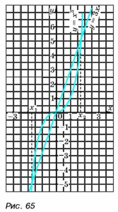 Построим в одной координатной плоскости графики функций у = х3 и у = 3х (рис. 65). Графики этих функций пересекаются в трёх точках. Уравнение х3 = 3х имеет три корня: - 1,7, 0 и 1,7. Заметим, что число 0 является точным значением корня, а числа -1,7 и 1,7 — приближёнными.