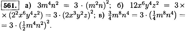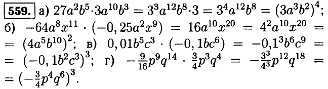 557. а) -8а5с3 = -ас • 8а4c2; б) -b6y9 = -by8 • b5у; в) 60х10у15 = 20x5у5 • 3х5у10. 558. a) (-10ab12)2 = 100a2b12 • 2 = 100а2b24; б) (-0,2 х4у)4 = 0,0016x4 • 4y4 = 0,0016x16y4; в) (-3ху2а3)3 = -27х3у2 • 3а3 • 3 = -27х3у6а9; г) (-0,5аb2с3)4 = 0,0625а4b2 • 4с3 • 4 = 0,0625а4b8с12.