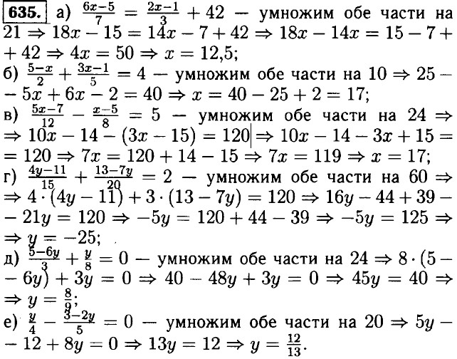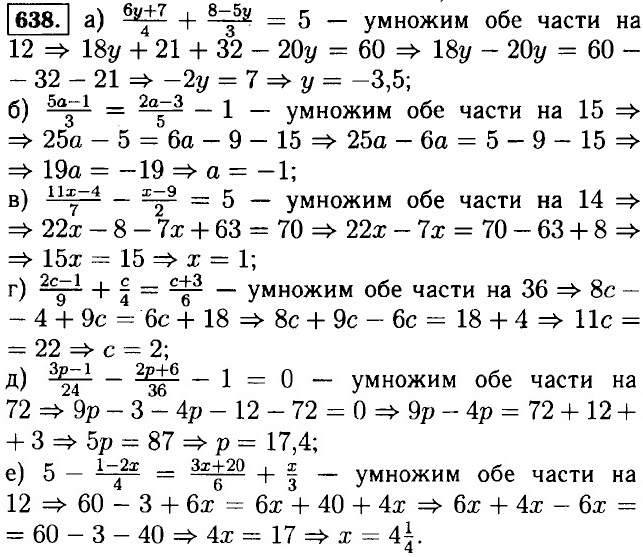 Домашние работы Умножение одночлена на многочлен (окончание)633. а) 2 • (3 - 5с) + 1 = 4 • (1 - с) ⇒ 6 - 10с + 1 = 4 - 4с ⇒ 10с - 4с = 6 + 1 - 4 ⇒ 6с = 3 ⇒ с = 0,5; б) -3 • (2х + 1) = 8х + 5 + 20 ⇒ -6х - 3 = 8х + 25 = 4 ⇒ -бх - 8х = 25 + 3 ⇒ -14х - 28 ⇒ х = -2; в) 3 • (5х + 7) = 61 - 10х ⇒ 15х + 21 = 61 - 10х ⇒ 15х + 10х = 61 - 21 ⇒ 25х = 40 ⇒ х = 1,6; г) 8 - у = 2 • (7 + у) ⇒ 8 - у = 14 + 2у ⇒ 2у + у - 8 - 14 ⇒ 3 у = -6 ⇒ у = -2. 634. б) в) г) д) е) ж) з) и)