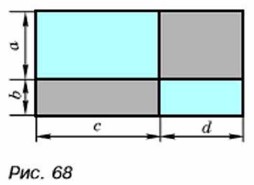 Заметим, что при умножении многочлена, содержащего m членов, на многочлен, содержащий n членов, в произведении (до приведения подобных членов) должно получиться mn членов. Этим можно пользоваться для контроля. В древности справедливость некоторых равенств при положительных значениях переменных математики доказывали геометрически. Так, великий греческий математик Евклид в своём трактате «Начала» (III в. до и. э.) справедливость равенства (а + b)(c + d) = ас + bc + ad + bd доказывал с помощью чертежа, изображённого на рисунке 68.