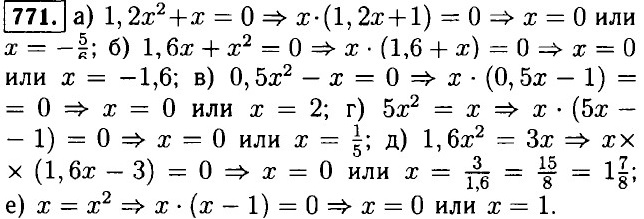 767. а) а20 - а10 + а5 - а5 • (а15 - а5 + 1) = а5 • (1 + а5 • (а10 - 1)); б) b60 + b40 - b20 = b20(b40 + b20 - 1) = b20b20b20 + 1) - 1); в) а10 - а8 - а6 = а6 • (а4 - а2 - 1) = а6 • (а2 • (а2 - 1) - 1); г) b40 + b20 + b10 = b10(b30 + b10 + 1) = b10(b10(b20 + 1) + 1). 768. a) 716 + 714 = 714(72 + 1) = 714 • 50; б) 531 - 529 = 529(52 - 1) = 529 • 24 - 527 • 600; в) 259 + 517 = 518 + 517 = 516(25 + 5) = 516 • 30; г) 2710 - 914 = 330 - 328 = 328(32 - 1) = 328 • 8 = 327 • 24; д) 1213 - 1212 + 1211 = 1211(122 - 12 + 1) = 1211 (144 - 11) = 1211 • 19 • 7; е) 119 - 118 + 117 = 117 • (112 - 11 + 1) = 117 • (121 - 10) = 117 • 37 • 3. 769. а) (а - 3b)(а + 2b) + 5а • (а + 2b) = (а + 2b)(а - 3b + 5а) = 3 • (а + 2b)(2а - b); б) (х + 8у)(2х - 5b) - 8у • (2х - 5b) = (х + 8у - 8у)(2х - 5b) = х • (2х - 5b); в) 7а2 • (а - х) + (6а2 - ах) (х - а) = 7а2 • (а - х) + (ах - 6а2)(а - х) = (а - х) (7а2 + ах - 6а2) = (а - х)(а2 + ах); г) 11b2 • (3b - у) - (6у - 3b2)(у - 3b) = 11b2 • (3b - у) - (3b2 - 6у)(3b - у) = (11b2 - 3b2 + 6у)(3b - у) = 2 • (4b2 + 3у)(3b - у). 770. а) 5сх + с2 = с • (5x + с): при х = 0,17 и с = 1,15 ⇒ с • (5x + c) = 1,15 • (5 • 0,17 + 1,15) = 1,15 • (0,85 + 1,15) = 1,15 • 2 = 2,3; б) 4а2 - аb = а • (4а - b): при а = 1,47 и b = 5,78 ⇒ а • (4а - b) = 1,47 • (4 • 1,47 - 5,78) = 1,47 • (5,88 - 5,78) = 1,47 • 0,1 = 0,147.