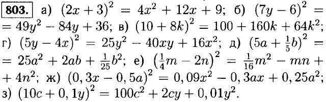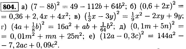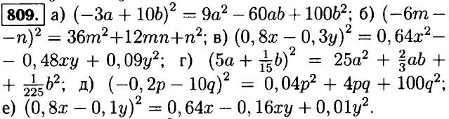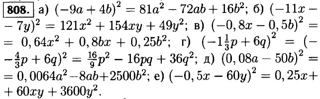 805. а) (-x + 5)2 = x2 - 10x + 25; б) (-z - 2)2 = z2 + 4z + 4; в) (-n + 4)2 = n2 - 8n + 16; г) (-m - 10)2 = m2 + 20m + 100. 806. а) (x + у)2 = (у + x)2 = (-x - у)2; б) (x - у)2 = (у - х)2 = (-у + x)2 = (-x + у)2. 807. а) (а - b)2 = а2 - 2ab + b2 = b2 - 2ab + а2 = (b - а)2; б) (-а - b)2 = (-а)2 + 2 • (-а)(-b) + (-b)2 = а2 + 2ab + b2 - (а + b)2.