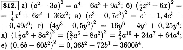 810. а) (100 + 1)2 = 10000 + 200 + 1 = 10201; б) (100 - 1)2 = 10000 - 200 + 1 = 9801; в) 612 = (60 + 1)2 = 3600 + 120 + 1 = 3721; г) 1992 = (200 - 1)2 = 40000 - 400 + 1 = 39601; д) 9992 = (1000 - 1)2 = 1000000 - 2000 + 1 = 998001; е) 7022 = (700 + 2)2 = 490000 + 2800 + 4 = 492804; ж) 9,92 = (10 - 0,1)2 = 100 - 2 + 0,01 = 98,01; з) 10,22 = (10 + 0,2)2 = 100 + 4 + 0,04 = 104,04. 811. a) (x2 - 5)2 = (x2)2 - 10x2 + 25 = x4 - 10x2 + 25; 6) (7 - y3)2 = 49 - 14у3 + у6; в) (2a + b4)2 = 4a2 + 4ab4 + b8; г) (-3p + q3)2 = 9p2 - 6pq3 + q6.