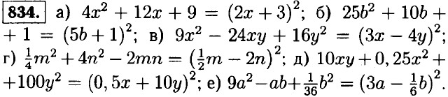 835. а) 81а2 - 18аb + b2 = (9а - b)2; б) 1 + у2 - 2у = (1 - у)2; в) 8аb + b2 + 16а2 = (b + 4а)2; г) 100x2 + у2 + 20ху = (10x + у)2; д) b2 + 4а2 - 4аb - (b - 2а)2; е) 28ху + 49х2 + 4у2 = (7х + 2у)2.