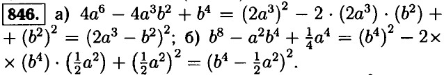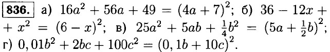 837. а) (3b + 2а)2 = 9b2 + 12аb + 4а2; б) (3x + 7у)2 = 9x2 + 42xу + 49у2. 838. а) b2 + 20b + 100 = (b + 10)2; б) b2 + 14b + 49 = (b + 7) ; в) 16x2 + 24xу + 9у2 = (4x + 3у) ; г) 9р2 - 42ру + 49у2 = (3р - 7у)2. 839. а) -1 + 4а - 4а 2= -(1 - 4а + 4а2) = -(1 - 2а)2; б) -42а + 9а2 + 49 = (3а - 7)2; в) 24аb - 16а2 - 9b2 = -(16а2 - 24аb + 9b2) = -(4а - 3b)2; г) -44аx + 121а2 + 4x2 = (11а - 2x)2; д) 4cd - 25с2 - 0,16d2 = -(25с2 - 4cd + 0,16d2) = -(5с - 0,4d)2; е) -0,49x2 - 1,4xу - у2 = -(0,49x2 + 1,4xу + у2) = -(0,7л + у)2. 840. а) у2 - 2у + 1 = (у - 1)2: при у = 101 ⇒ (у - 1)2 = (101 - 1)2 = 1002 = 10000; при у = -11 ⇒ (у - 1)2 = (-11 - 1)2 = (-12)2 = 144; при у = 0,6 ⇒ (у - 1)2 = (0,6 - 1)2 = (-0,4)2 = 0,16; б) 4x2 - 20x + 25 = (2x - 5)2: при x = 12,5 ⇒ (2x - 5)2 = (2 • 12,5 - 5)2 = 202 = 400; при x = 0 ⇒ (2x - 5)2 = (2 • 0 - 5)2 = (-5)2 = 25; при х = -2 ⇒ (2x - 5)2 = (2 • (-2) - 5)2 = (-4 - 5)2 = (-9)2 = 81; в) 25а2 + 49 + 70а = (5а + 7)2: при а = 0,4 ⇒ (5а + 7)2 = (5 • 0,4 + 7)2 = (2 + 7)2 = 92 = 81; при а = -2 ⇒ (5а + 7)2 = (-2 • 5 + 7)2 = (-10 + 7)2 = • (-3)2 = 9; при а = -1,6 ⇒ (5а + 7)2 = (-1,6 • 5 +7)2 = (-8 + 7)2 = 1. 841. а) верно; б) x2 + 20x + 100 = (x + 10)2 ≥ 0: при x = -10; (x + 10)2 = 0 — не верно. 842. а) x2 - 30x + 225 - (x - 15)2 ≥ 0; б) -x2 + 2xу - у2 = -(x2 - 2xу + у2) = -(x - у)2 ≤ 0. 843. a) x2 - 16x + 64 = (x - 8)2 ≥ 0; 6) 16 +8x + x2 = (4 + x)2 ≥ 0; в) -x2 - 4x - 4 = -(x2 + 4x + 4) = -(x + 2)2 ≤ 0; г) -x2 + 18x - 81 = -(x2 - 18x + 81) = -(x - 9)2 ≤ 0.